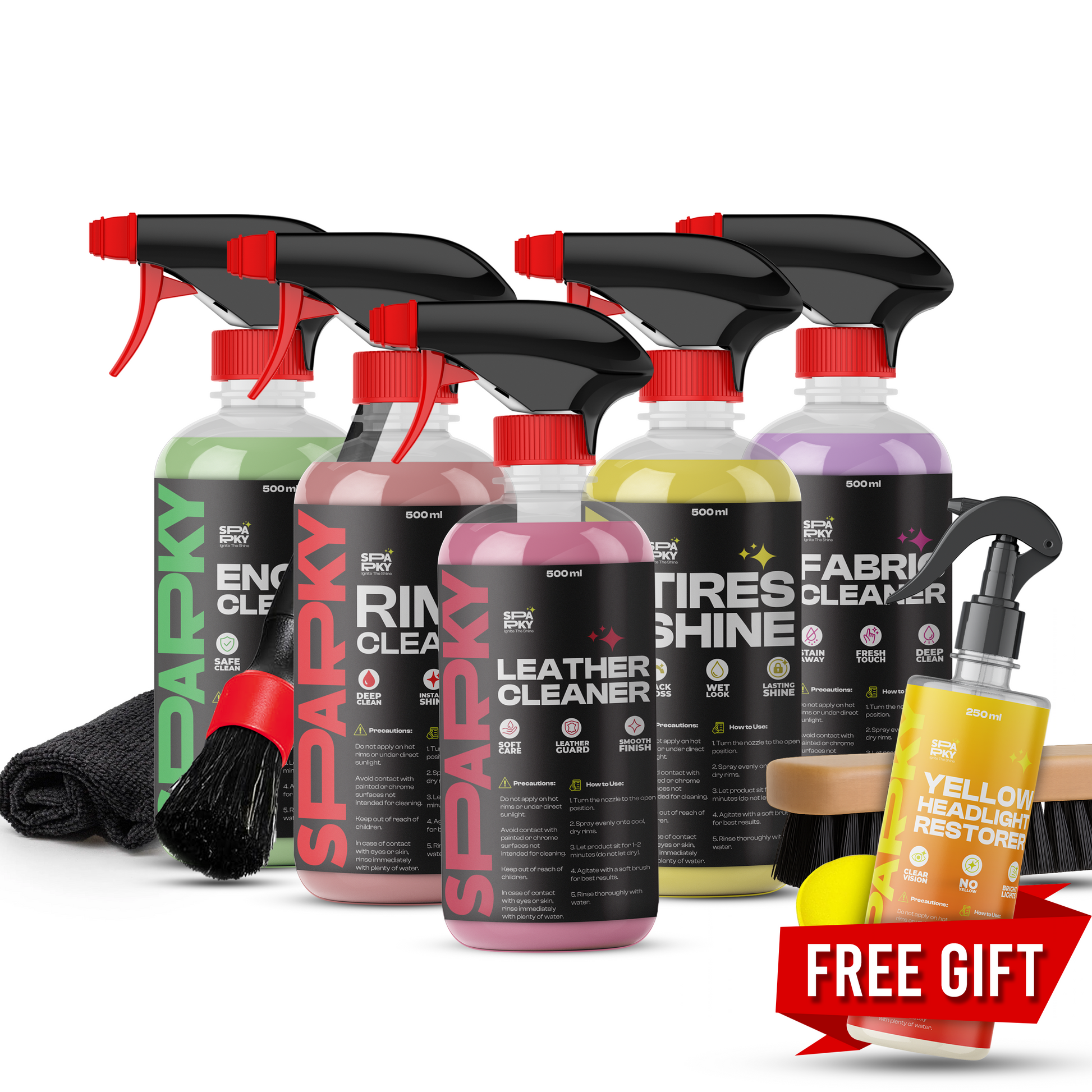 All In One Kit – Keep your car spotless with our complete care package. Includes engine cleaner, fabric cleaner, leather cleaner, rims cleaner, yellow headlight restorer, tire shine, plus a super brush, horsehair brush, magic microfiber cloth, and cleaning sponge for flawless results every time.