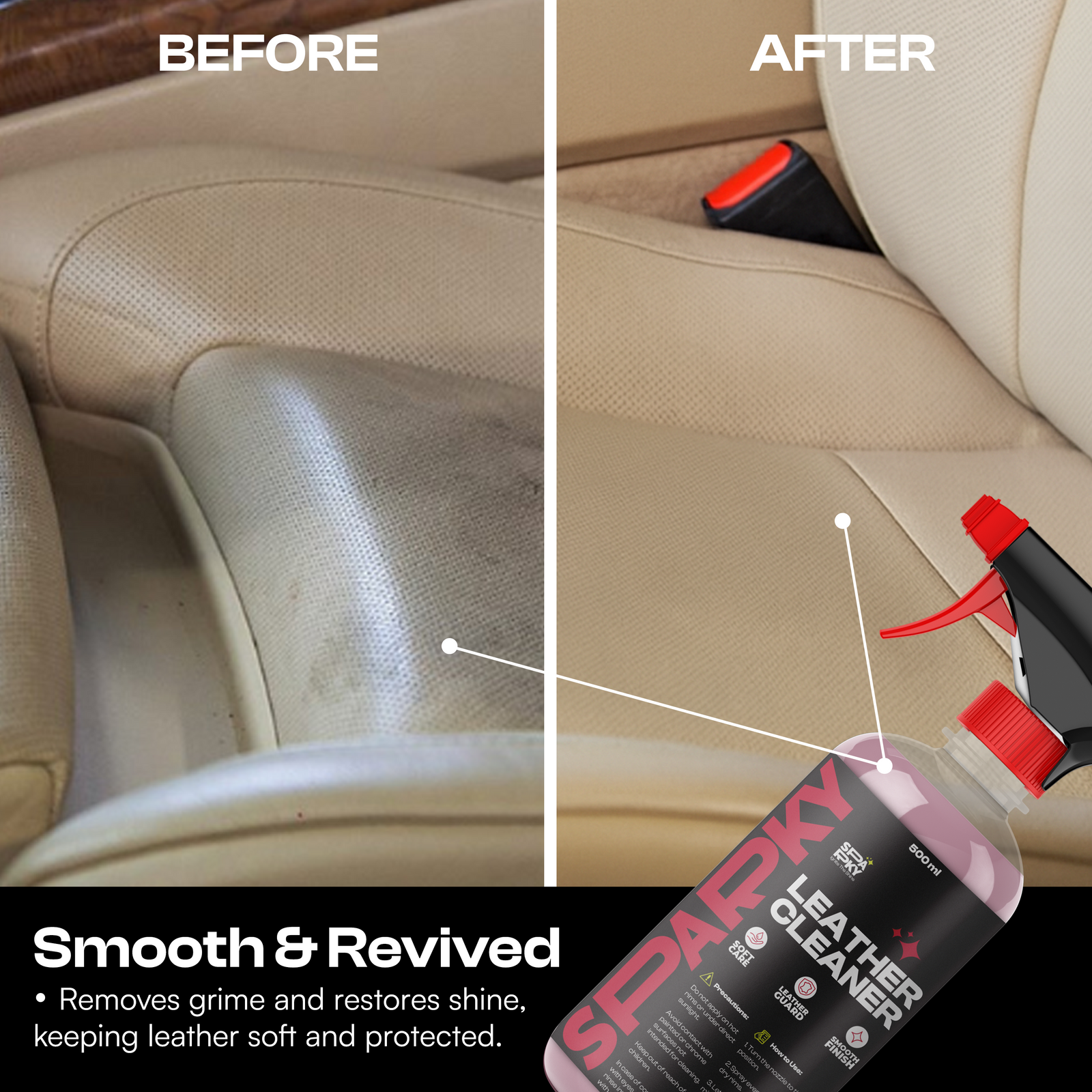 Leather Cleaner – Gently removes dirt and restores softness, keeping leather seats smooth and protected.